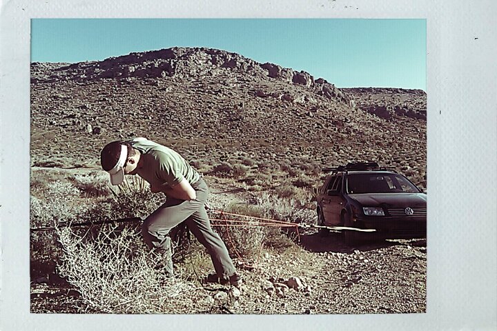The severity of the situation settled in. You can’t run a diesel without oil, you will destroy the engine. I know no one in Vegas to help. Two guys can’t push a car uphill. We had to get to the bottom of the second wash to warrant any chance of getting help from AAA. We unloaded the car again (everything- skis, ropes, clothes, kettlebell, food, books, spare tire– everything), and pushed the car into the second wash. We got about 5 feet up the other side of the wash and I popped the E-brake to hold our progress. We tried pushing, but lost ground quickly. We brainstormed other ideas for getting help, and we realized that no one we would find could help us unless we made it to the bottom of the second wash- just below the smooth gravel road out.
