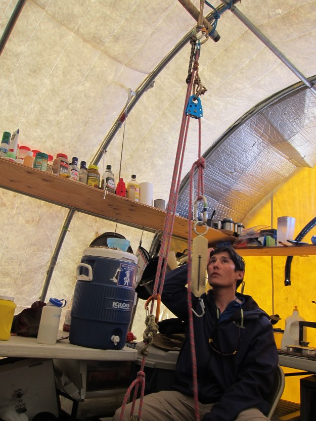 At the same time, we’ve had a lot of fun in the bad weather. Tonight the tent was full of good food, bad whiskey, friendly faces, and homemade fudge from my NOLS recipe. Good serious conversation, good silly conversation, and a staunch optimism that we would all eventually get home. We haven’t seen a plane in a few days, but most folks are just staying relaxed.