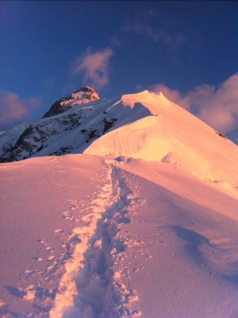 After the Great Icefall, the Muldrow glacier technically ends in a large bowl below a massive jumble of ice- the Harper Icefall looks like a giant alligator waiting to eat you. Fortunately the mountain provides gorgeous detour around this feature by following Karstens Ridge for approximately 3,000 vertical feet just east o the Icefall. This ridge is arguably the most beautiful and engaging climbing of the route.