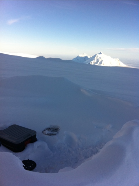 The next few days were lost in a blur of furious activity. The rest of our team arrived at 14 and we put our backs into getting things packed tight. The weather unfortunately, rewarded our efforts with a whiteout and unfliable conditions for 3 straight days. With loads rigged and ready, we were stuck until we could fly loads. Most volunteers had flights on the 14 and 15, so the evening of July 12, one ranger and 7 volunteers left on ski/snowshoe to walk to basecamp and fly out, while one ranger, myself, and 2 other volunteers with looser time commitments stayed behind to finish packing and fly loads once the weather broke. We knew we still had a lot of work to do, but it was a hurry up and wait situation, with 7 folks not being able to wait any longer. The 8 folks walking down had their own adventure in the horrendous conditions of the lower glacier- multiple cravasse falls, whiteout, and slogfest conditions were reported.