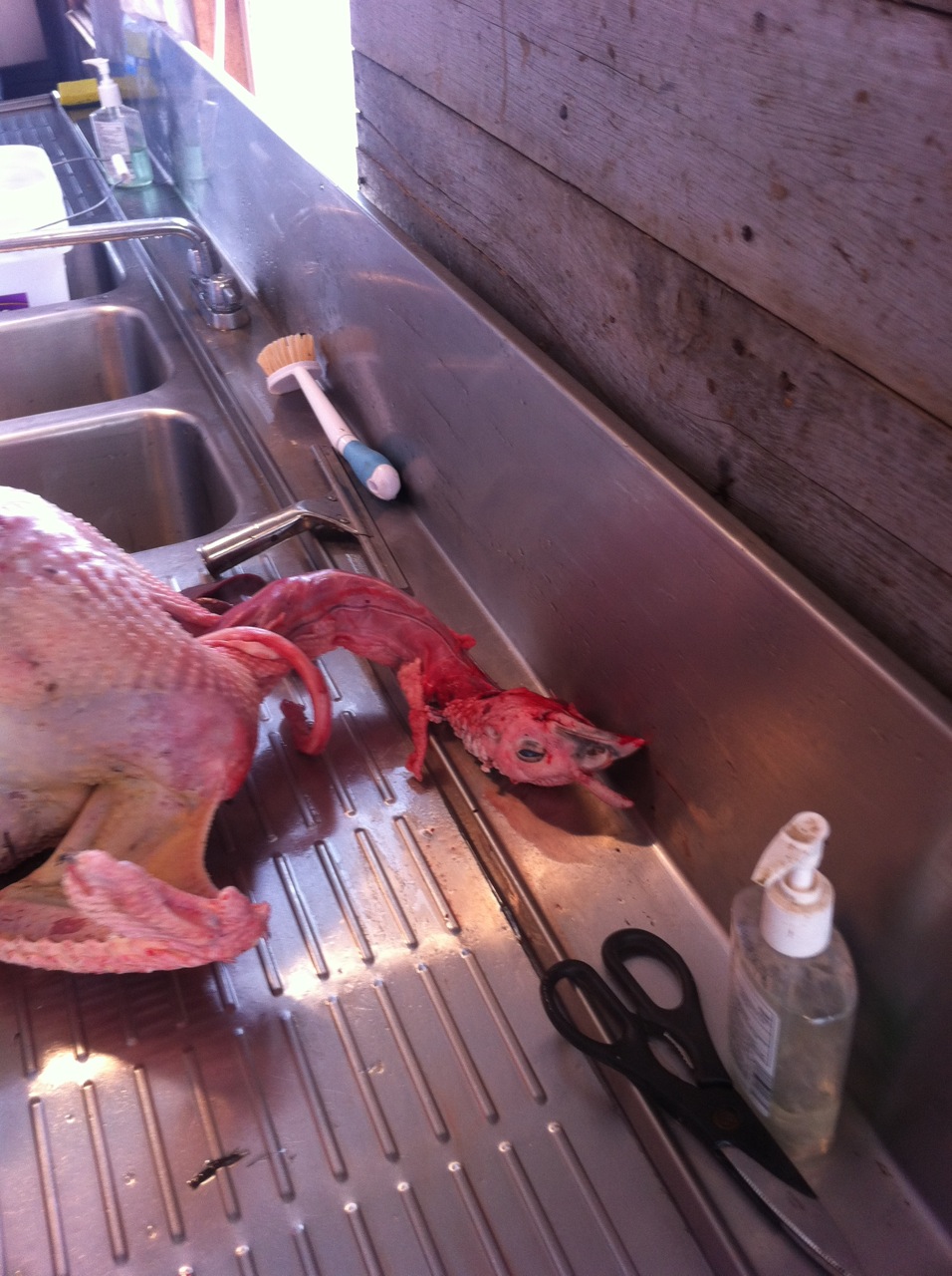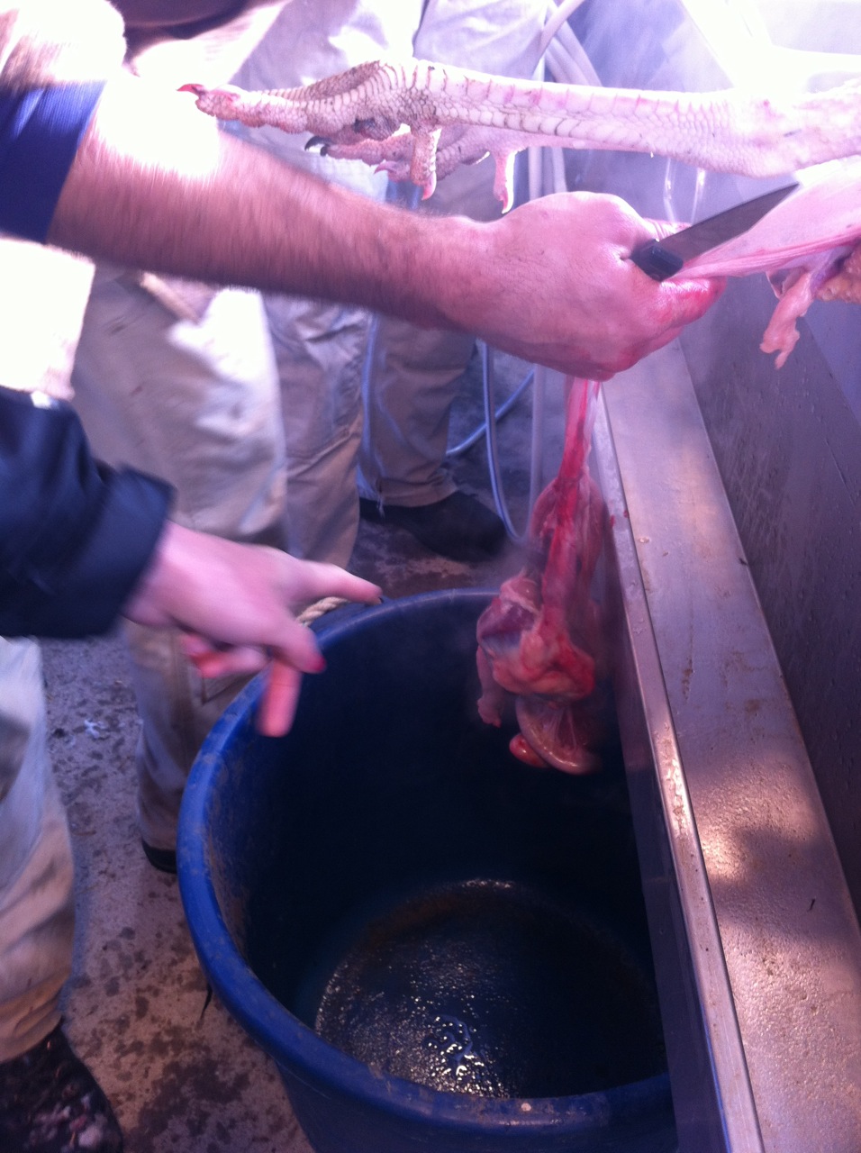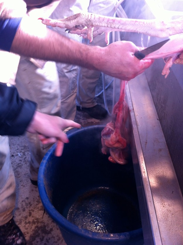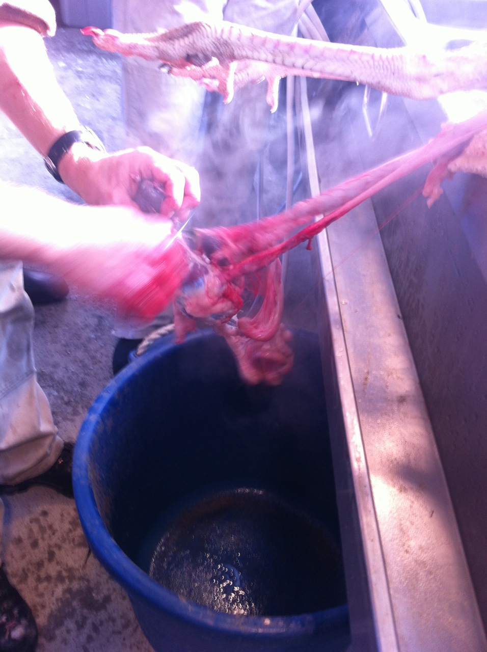 Yeah, we were all actually smiling most of the time. You don’t think about the act of killing much. The urgency of the work, the desire to kill the birds as quickly and humanely as possible, and quality of people supporting their belief in local, sustainable, free-range, organic poultry is way more powerful than pity. This is part of the food system solution. This is what it is supposed to look like. In non-organic (“chemical”) farms, the scene is not nearly so rosy. We would have been wearing respirators and processing thousands of birds on a mechanical assembly line.