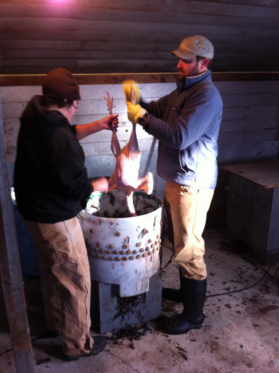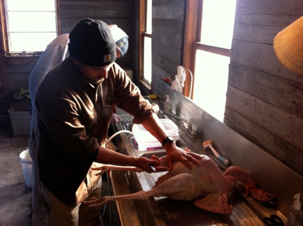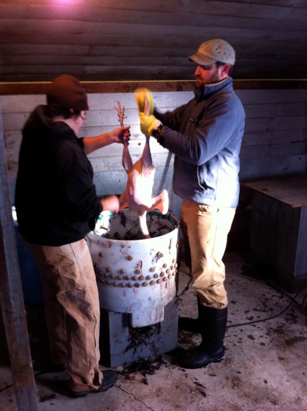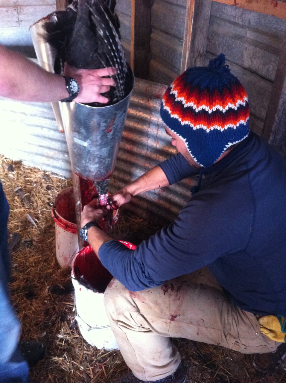 Yeah, we were all actually smiling most of the time. You don’t think about the act of killing much. The urgency of the work, the desire to kill the birds as quickly and humanely as possible, and quality of people supporting their belief in local, sustainable, free-range, organic poultry is way more powerful than pity. This is part of the food system solution. This is what it is supposed to look like. In non-organic (“chemical”) farms, the scene is not nearly so rosy. We would have been wearing respirators and processing thousands of birds on a mechanical assembly line.
