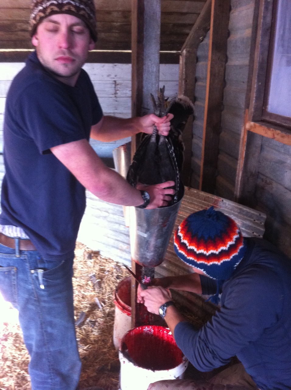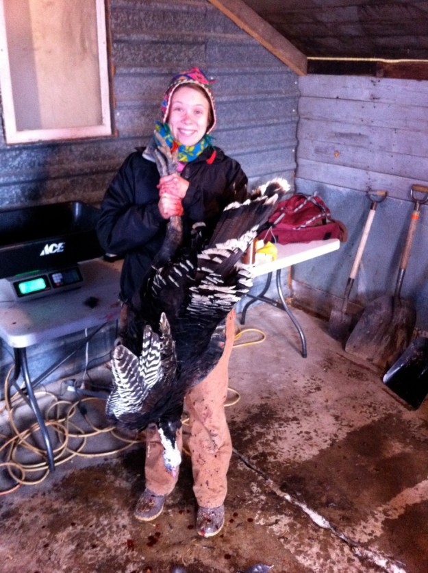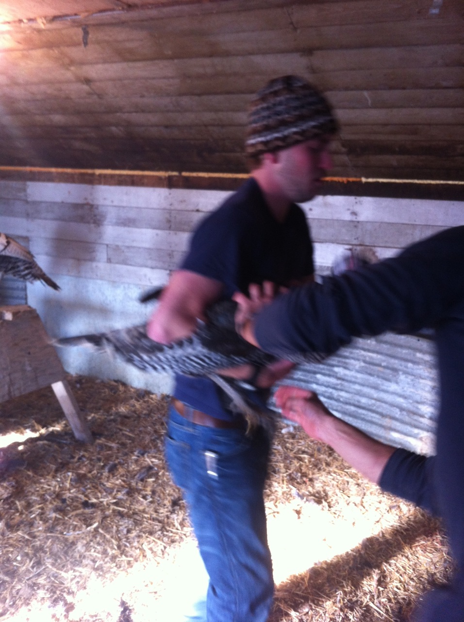 We aimed to kill about 50 birds each day. The birds for that day were kept inside so we could chase and snatch them in a smaller area (it makes a huge difference), and the snatching was often one of the more hazardous parts. Turkeys are strong and they are fighting for their lives- they kick, scratch, peck, and flap like they mean to live. It’s a humbling thing to feel the last few breaths their of life in your hands.