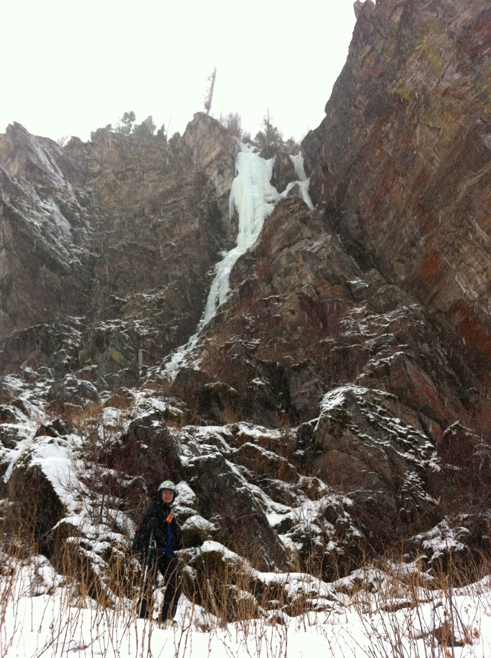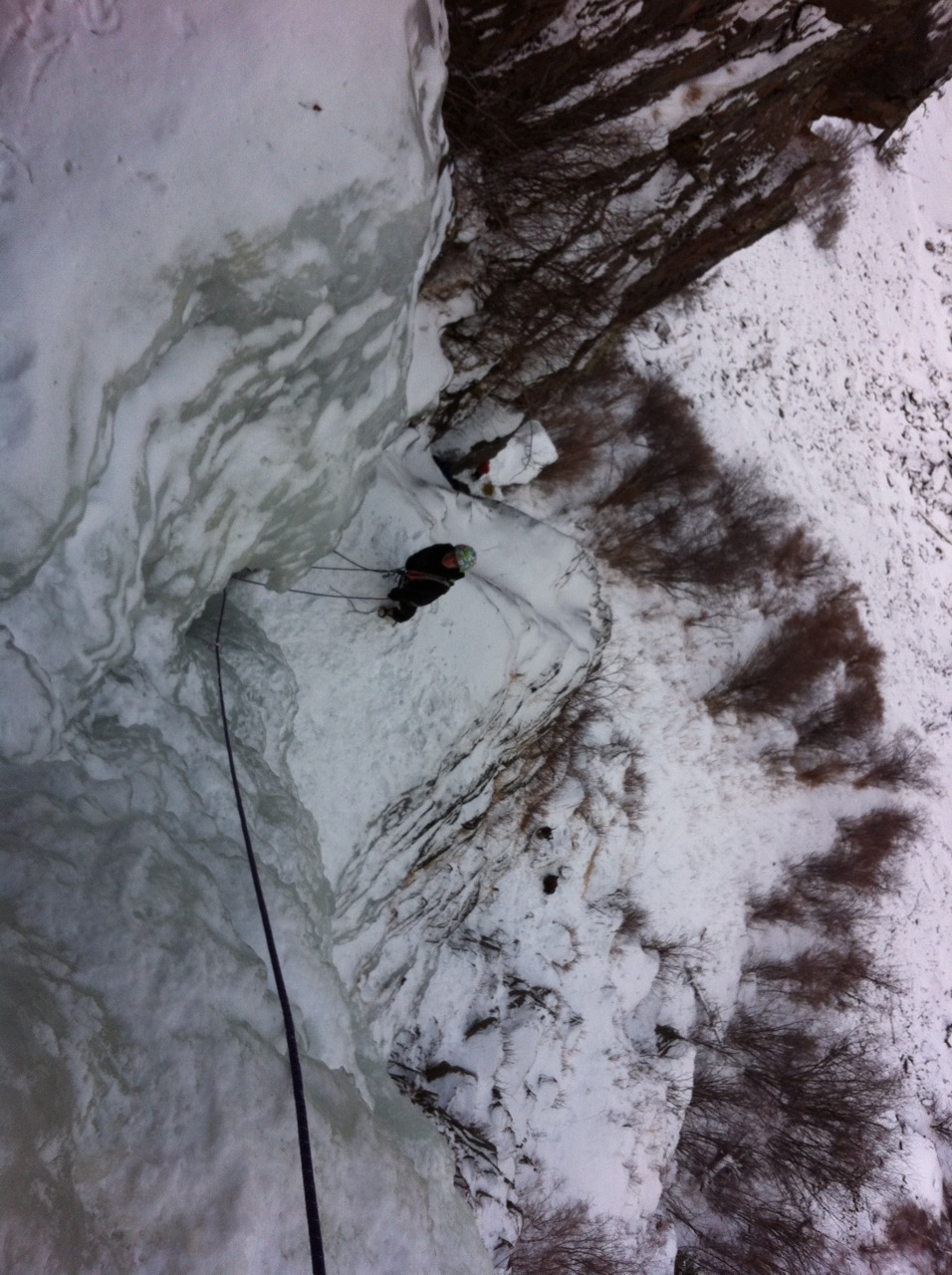 This past Saturday night I was playing my bass with some people and feeling antsy. Talk to Hannah to learn she had almost recovered from her cold, so at the last minute we made plans to climb Sunday morning. Happily, I finally got to tick the Graineater (70m, WI4, 2p)- the local classic is exactly that, classic. A few photos: