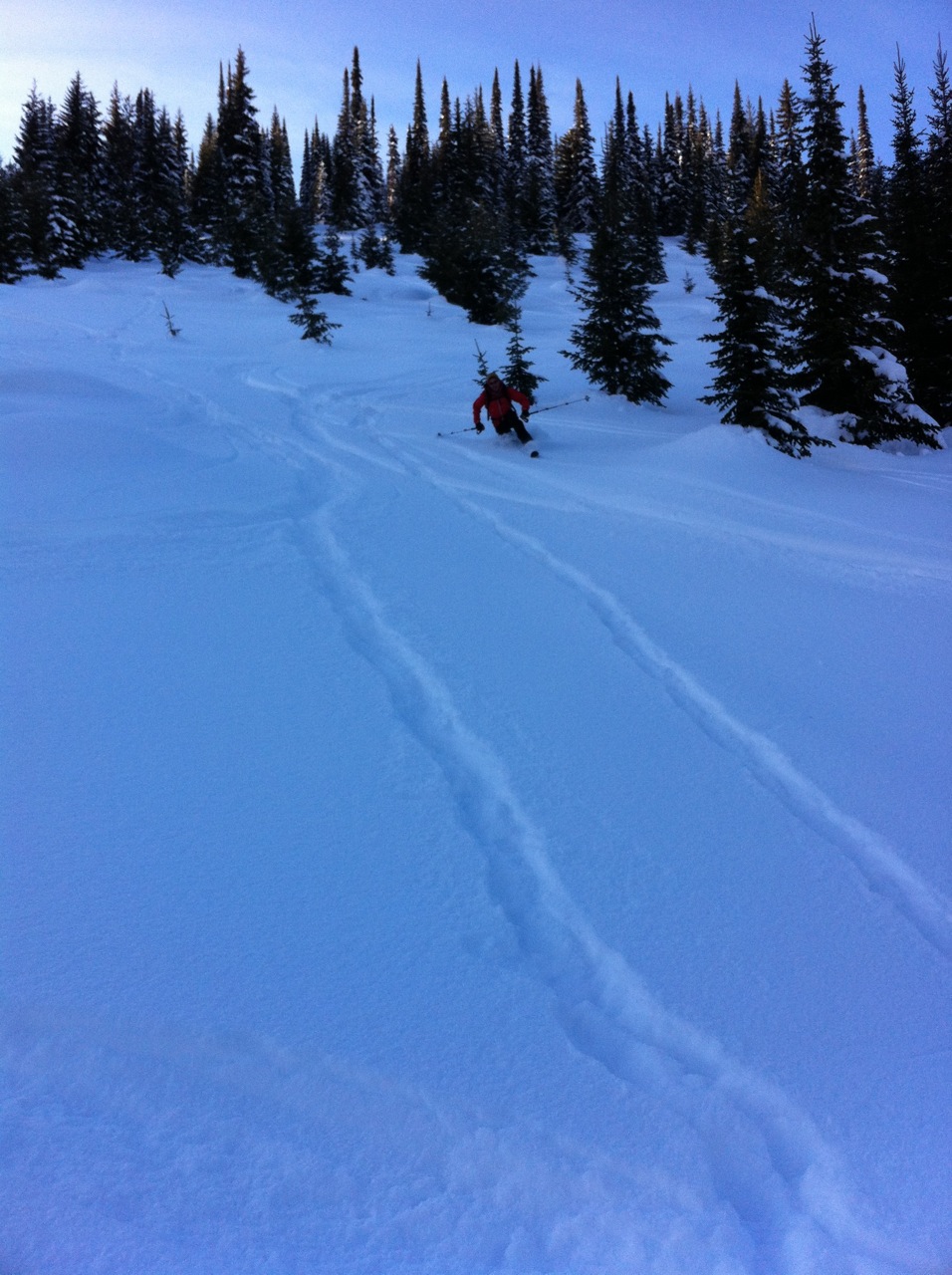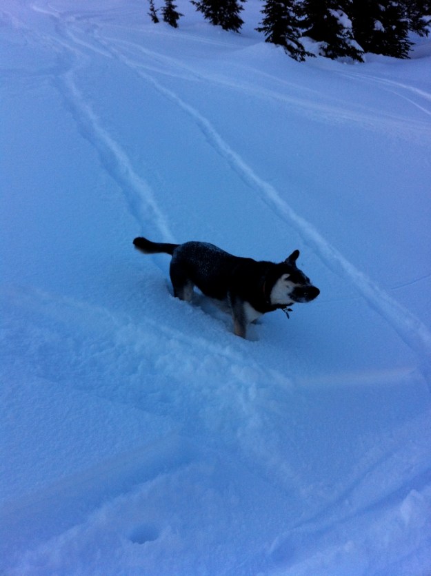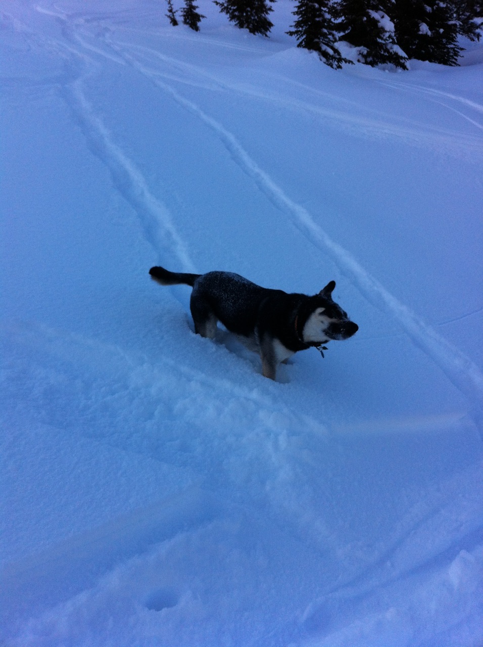 We started skinning into “the Crystal Theater” exactly 1h 10min after leaving Gwen’s house, and found 18″ of deliciously dry powder and stable avalanche conditions. Full of stoke, we boogied to the top of the highest thing we could see well before the sun dropped behind the ridge, and proceeded to enjoy face shots almost all the way back to the flats.