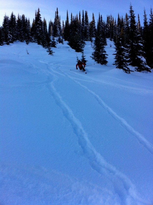 Our first run was “exploratory” as the cold temps and bright sun had definitely baked the south aspect, but we headed deep into new territory and found the goods on round two.