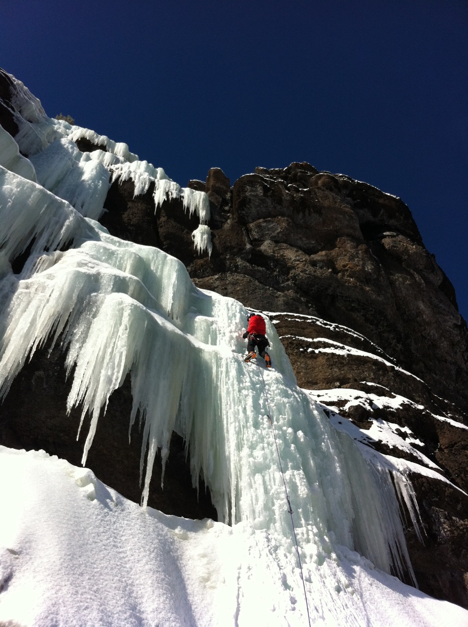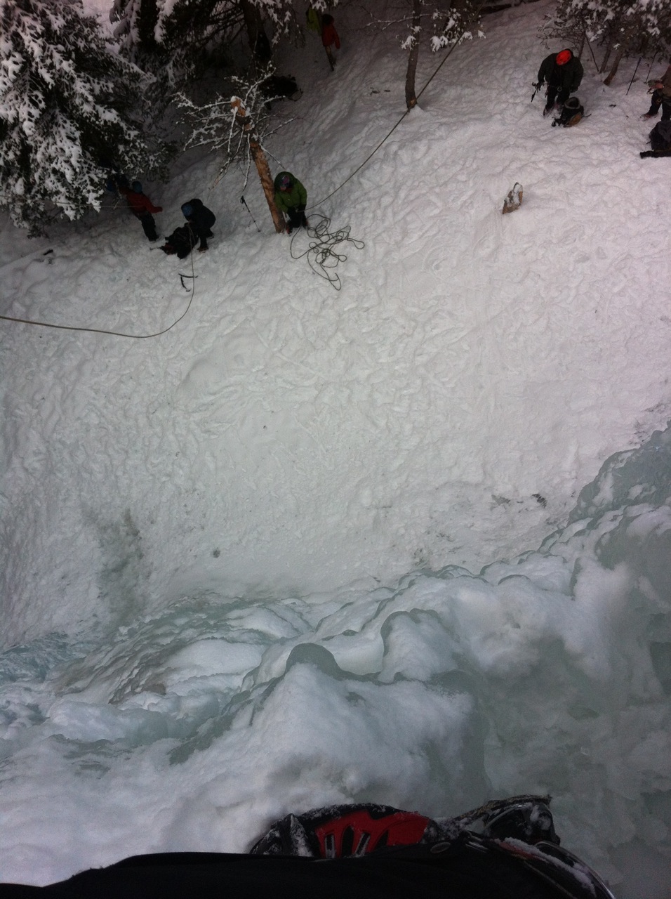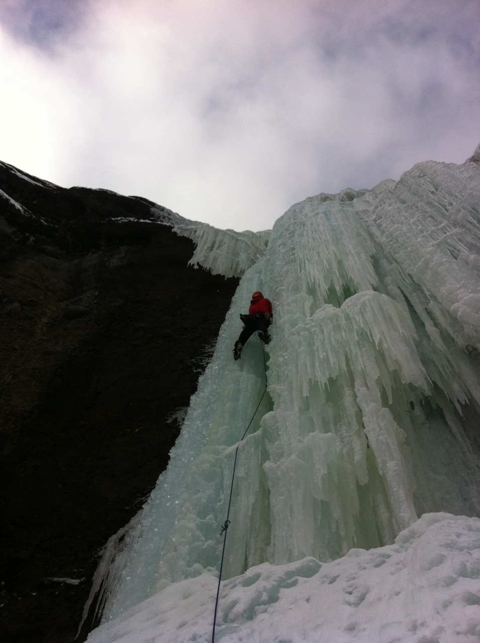 Sunday, still a bit sore, we went back to Genesis I, a wall of ice close to the car that offers a variety of terrain- low angle to super steep, and burned 3 top rope laps each on the steepest section we could find. It felt good to practice the craft.