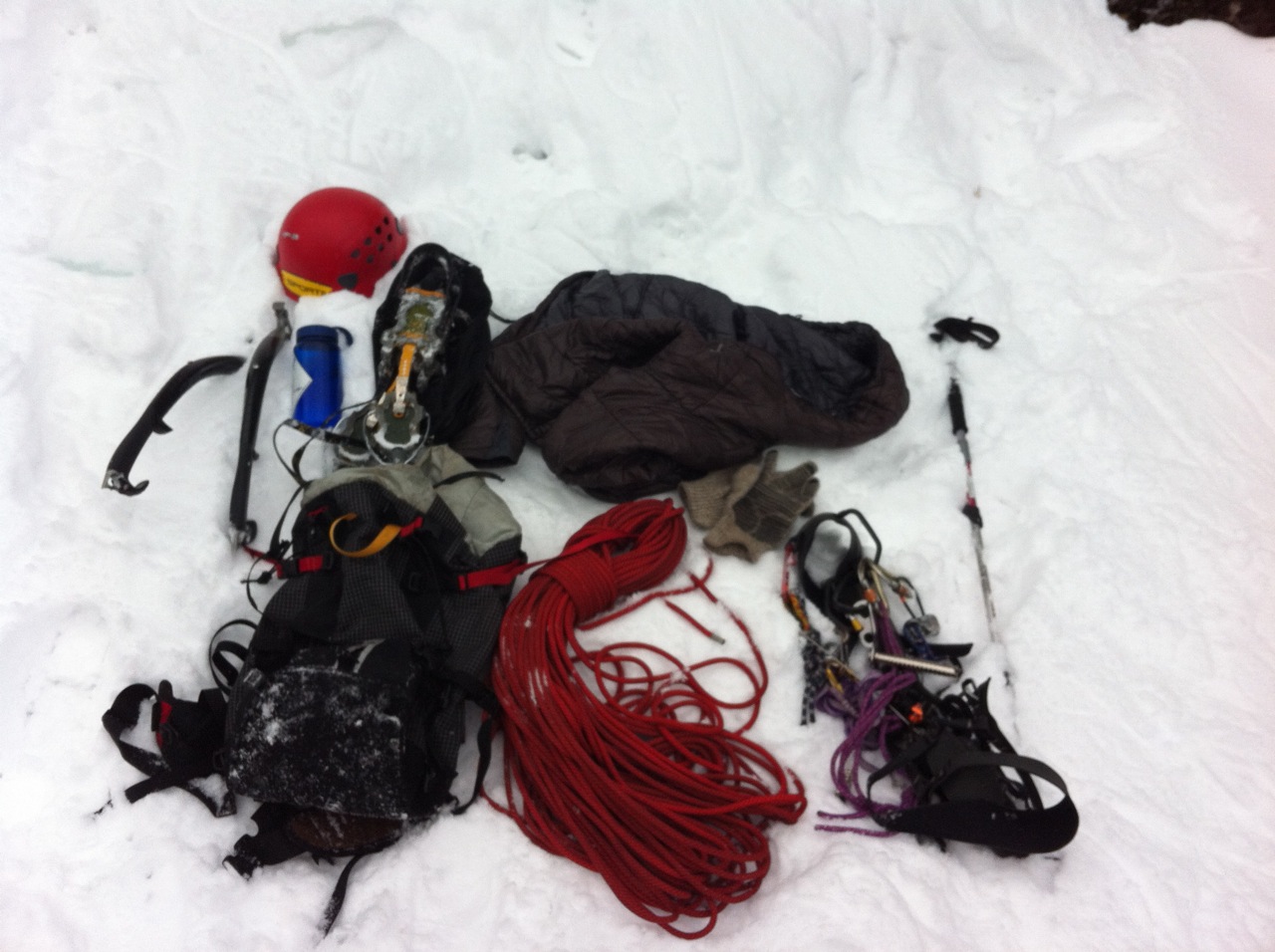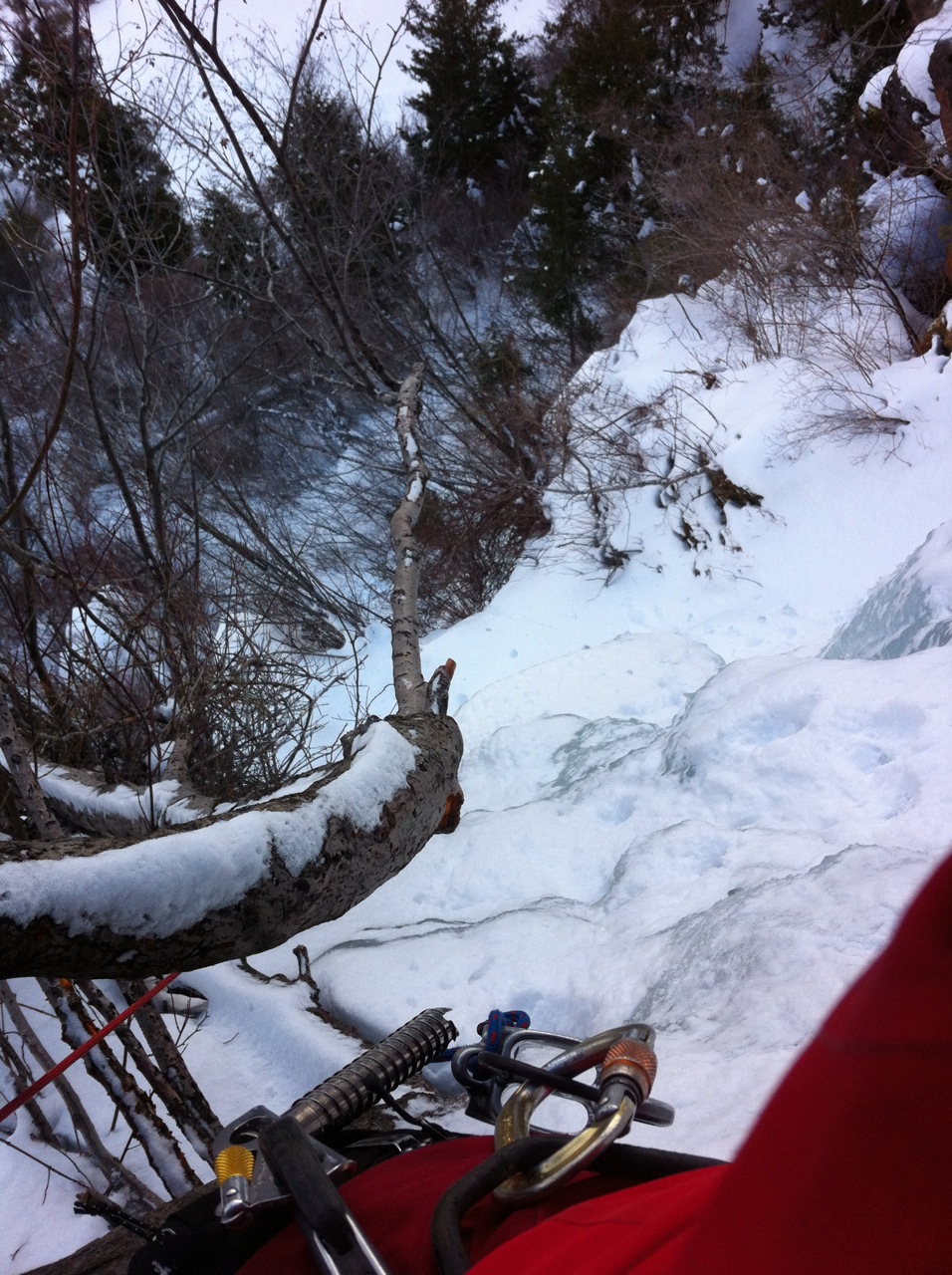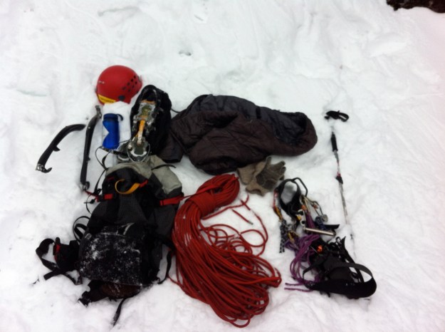Last weekend, Drew and I had reflected on solo ice climbing- the clean minimalism, the quiet, the focus. You don’t need much. I probably still take more than most, but the thing that I notice most about my solo kit is my red Sterling 7mm tag line for rappelling off. It’s light, long enough (75m) to give me plenty of space to play, and packs down small- it’s all I really need. Harness, tools, pons, helmet, puffy coat, and the red rope- clean and simple.