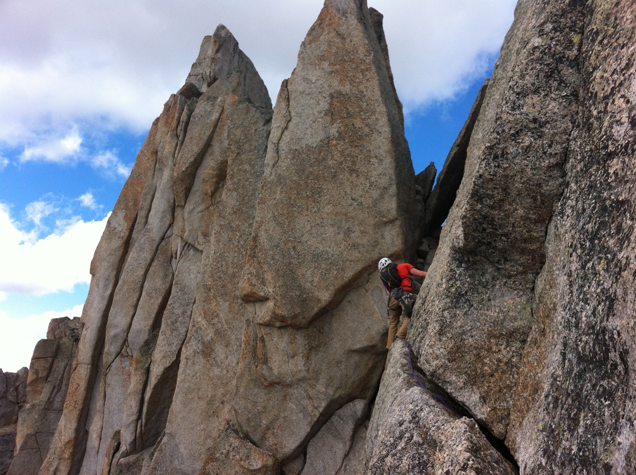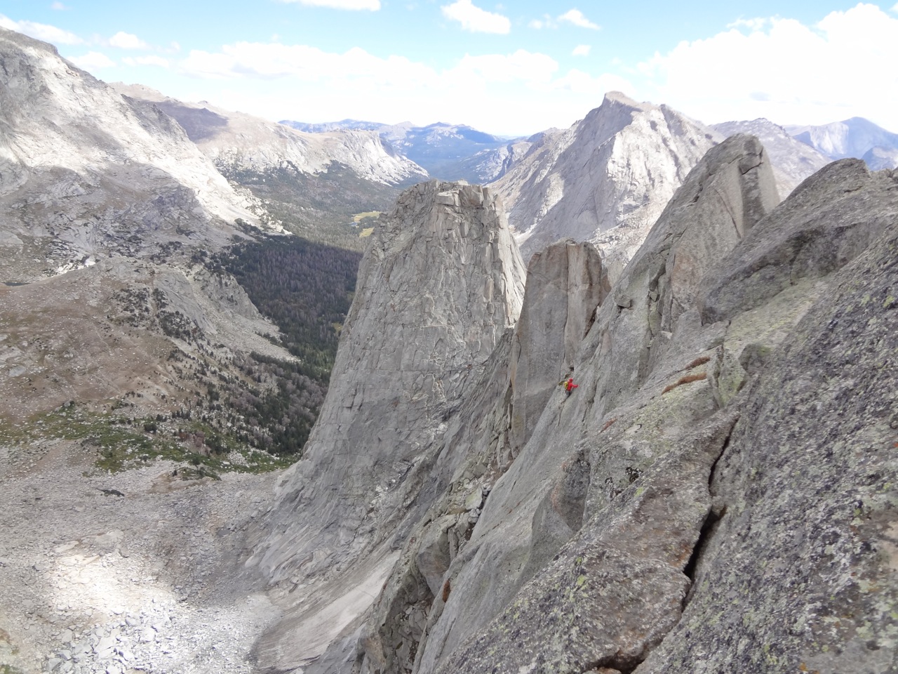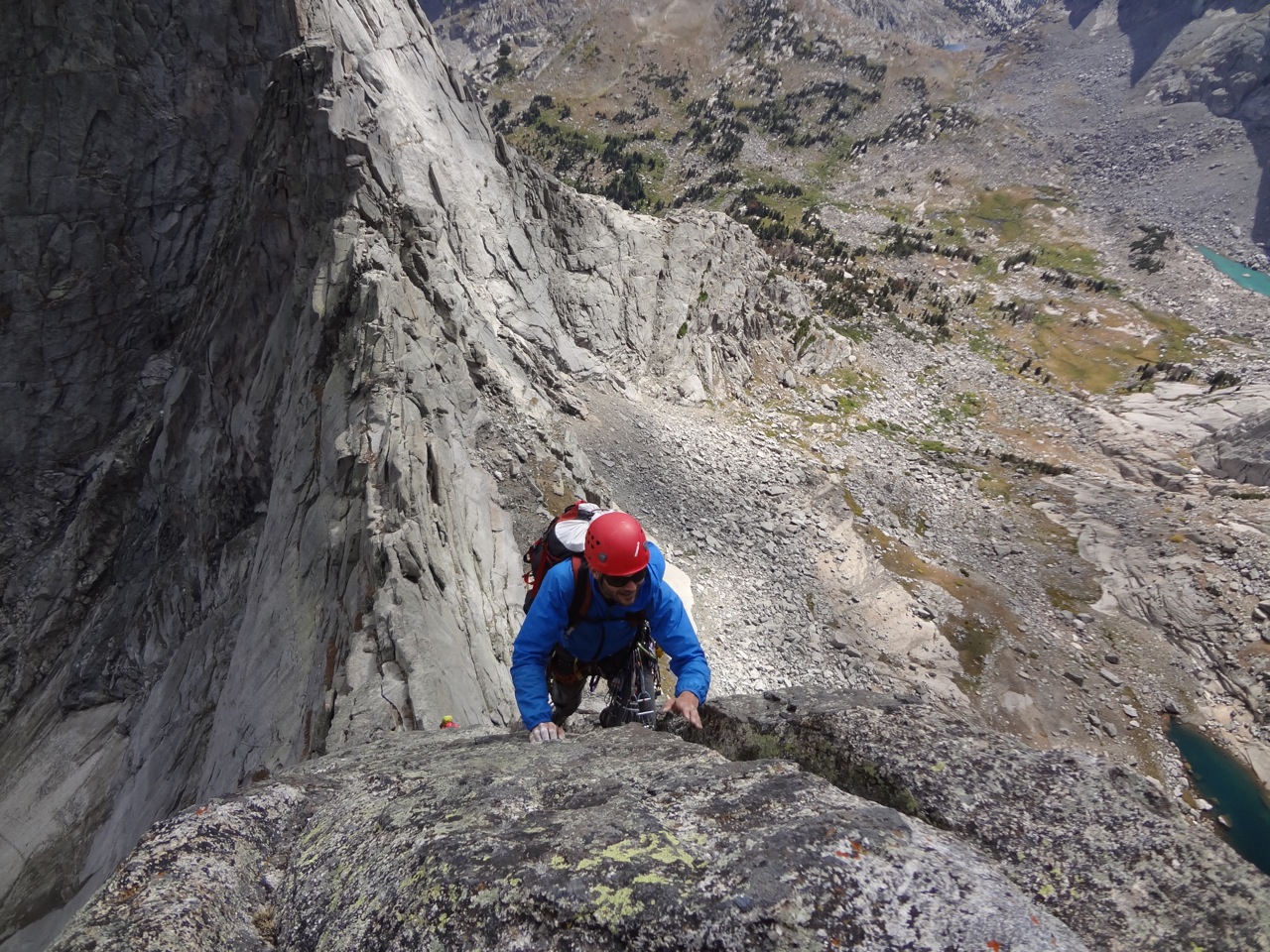 The four of us found a good ledge, Bryan tied into my extra rope, and he and I simulclimbed the rest of the route. Per it’s inclusion in “50 Classic Climbs of North America” it is hilariously fun climbing. Route description is “climb the crest of the ridge, weaving between towers.” You might add- “follow sinker hand cracks and large chimneys, along with everyone else in the Cirque.” The route wasn’t crowded per se, but there were two parties that finished before us, and at least two more that finished after us. I was glad to move fast with Bryan. Not exactly solitude for a Wednesday afternoon. We met Liz and Ryan rapping off, and enjoyed a dip in the lake on the way down.