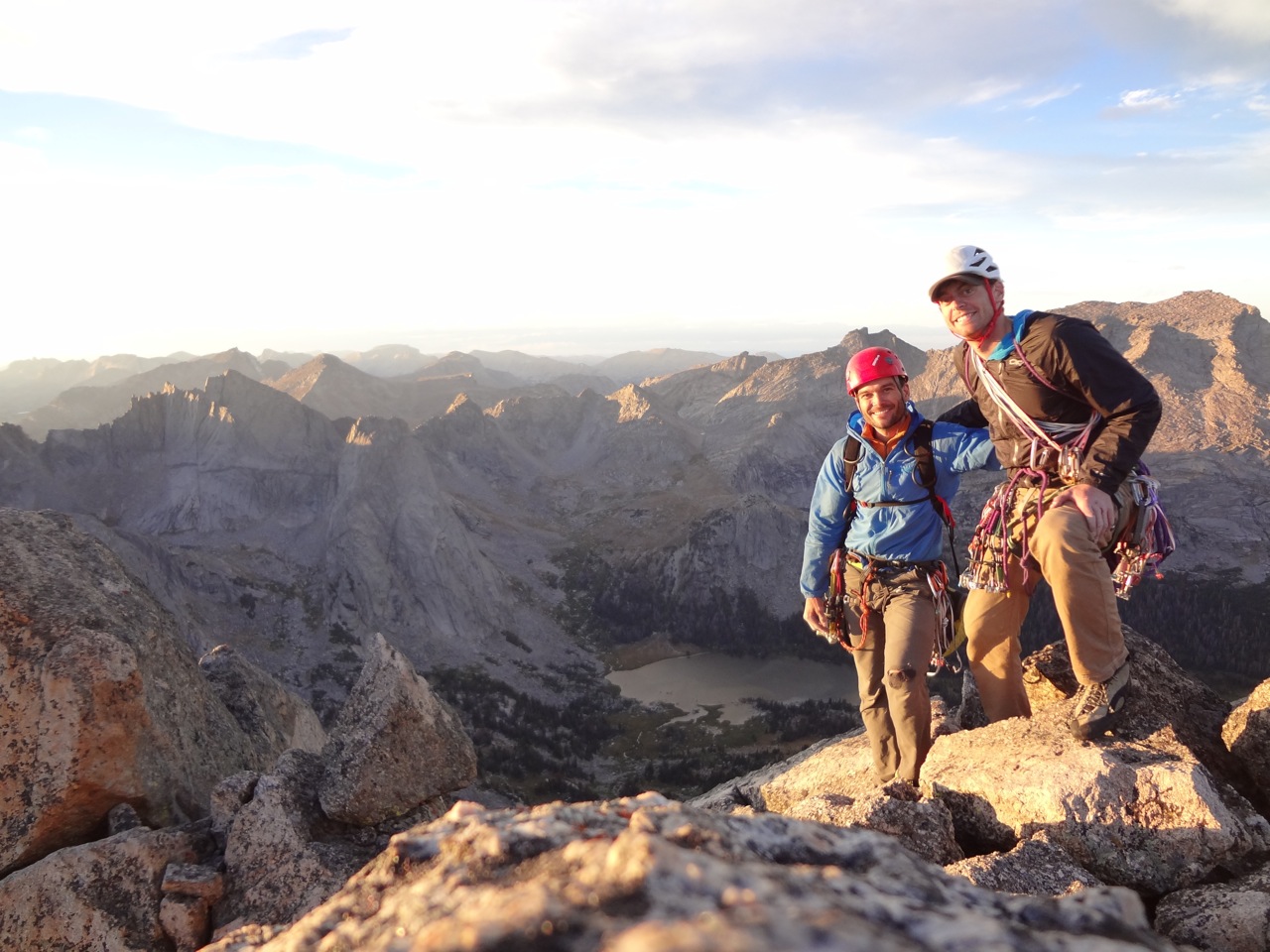 We swung leads through the afternoon and stretched the full 60m on almost every pitch. The climbing was perfect, sustained, and secure. Being on the third big route in three days, but left foot was ready for rest, but good weather and a great partner kept my stoke high enough to push through the pain. Andy and Jon followed closely. I popped out the last chimney pitch just as the evening colors were getting good. Bryan and I scouted the raps while waiting for Jon and Andy to finish up and shared the summit with our new friends just before sundown.
