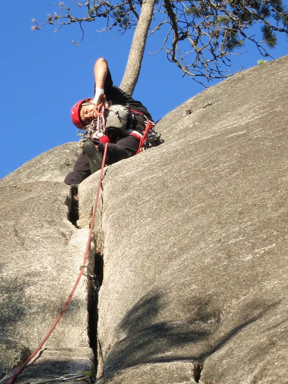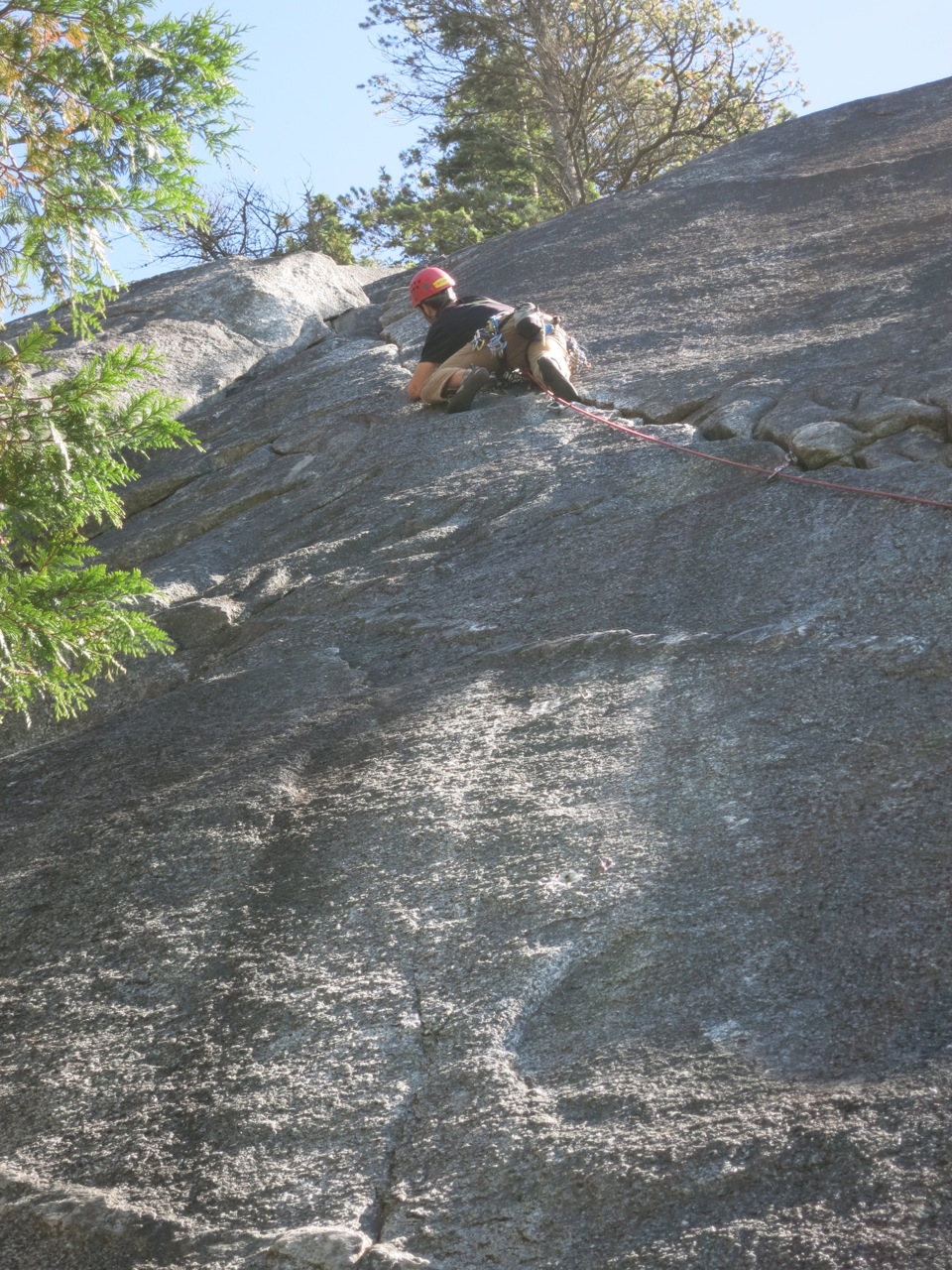 Dustin and Gaio were headed home for more work on the roof on Friday night, and I knew they needed to experience a multipitch line before they left. We accounted for being a team of 3 and our relative skill levels, picking our way through the forest to “Cream of White Mice” (II, 5.9, 4 pitches). It was the perfect outing- some finger cracks, a dyke, a nice 5.8 slab traverse and a tricky ending, with 4 rappels back to camp for a perfect outing. Disneyland sure is fun.