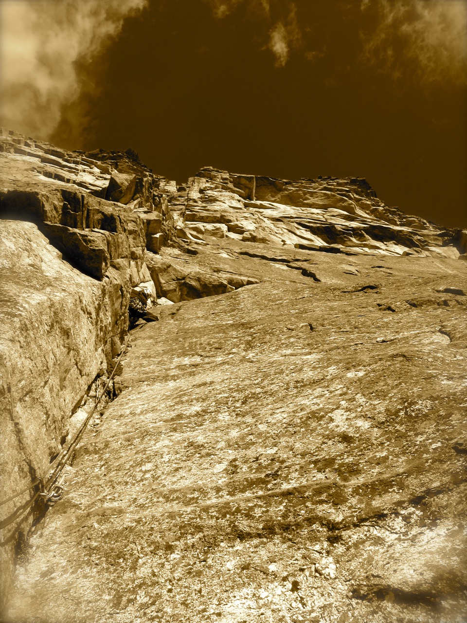Gear: single master cams 0-3, doubles #0.4-#2, (1) 3, (1) 4. We took a set of nuts, but the only one I placed fell out (dang… rusty). 6 slings, 6 draws, cordalette. You might want an extra #3 for p.4. Most of the climbing is legit 5.9.