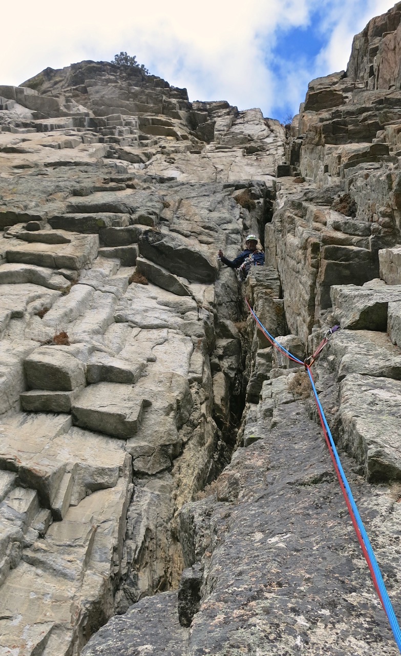 We did the climb as 4 pitches instead of 5. You can also do it in 3 long pitches, but the pitch 1.5 belay is not a great ledge, and it adds a lot of rope drag to the route when you want it least. Pitches 1 & 2 are very straightforwards. Pitch 3 wanders up a funky gully feature that was harder than I remembered. Pitch 4 takes large gear, or not much gear (Michael’s preference), leading to an excellent hand crack at the top of the feature. I had only done it once before, and we had a blast doing it again.