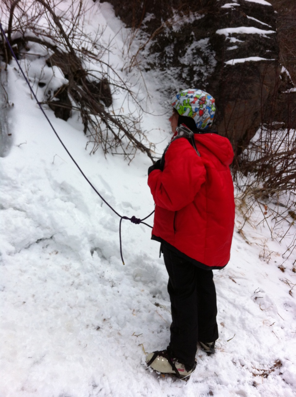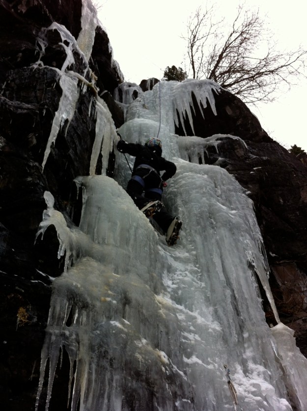 This past Saturday night I was playing my bass with some people and feeling antsy. Talk to Hannah to learn she had almost recovered from her cold, so at the last minute we made plans to climb Sunday morning. Happily, I finally got to tick the Graineater (70m, WI4, 2p)- the local classic is exactly that, classic. A few photos: