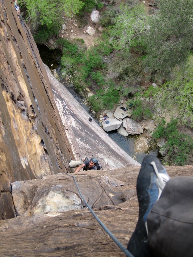 Tuesday, with the car, gear, and itinerary back in order, we decided to stay one additional day in Vegas in order to do a little bit of the climbing that had originally inspired me to include Red Rocks on my itinerary. As we discussed our objectives, I discussed big crack systems and traditional climbing protection, inserted and removed by the climbers as they pass over the terrain (most of our climbing to this point has been on sport routes with bolted protection). Jordan has limited experience with this type of climbing, and while it is what I hope to focus on for the rest of the trip, I realized I hadn’t led more than 5 trad route since foot surgery. We warmed up on two easy 5.7 pitches, which despite a crowd of other climbers, went easily. We headed for the shade and the ultra-classic Dark Shadows route and sent the first four pitches (the most classic part) easily as well. I’m calmer on lead above my gear, but still have a lot of work to do in recognizing the right sizes to get gear in quickly. Rappeling off the route however, I started to get distracted with some serious foot pain on both feet. My old surgery site, and the bunion growing on my right big toe. I’m worried about the implications this could have for my continued activities.