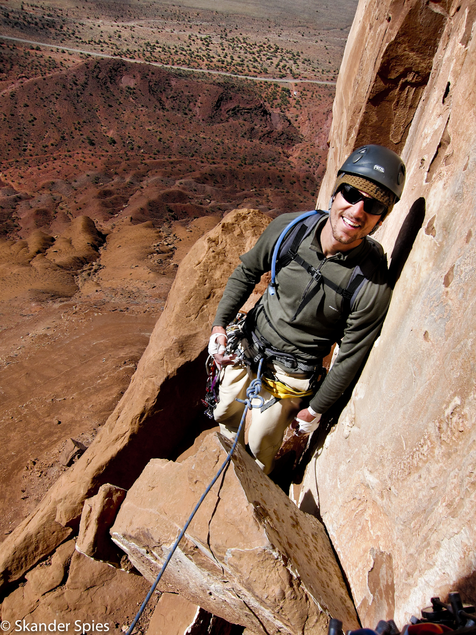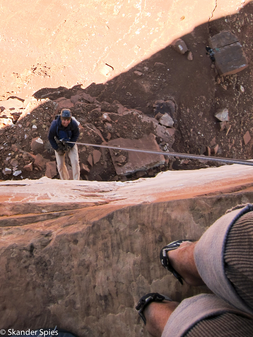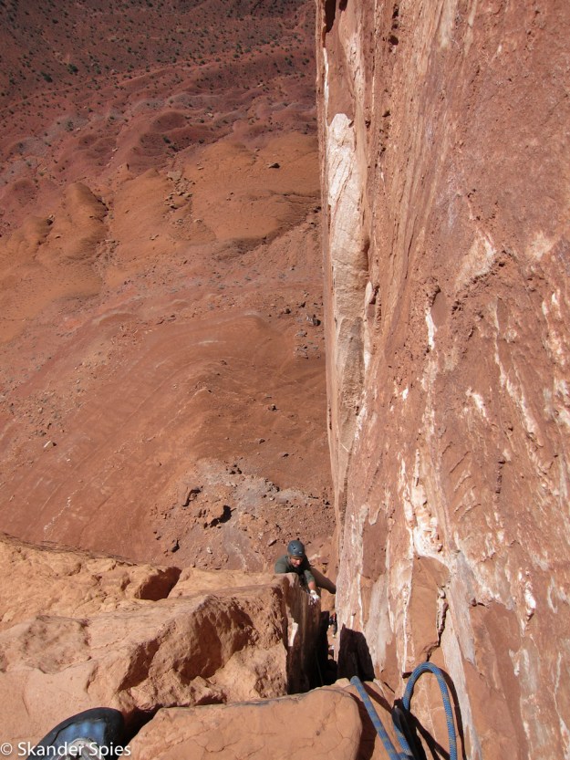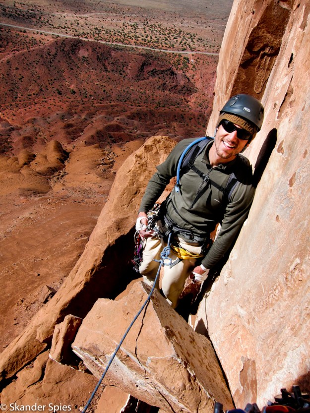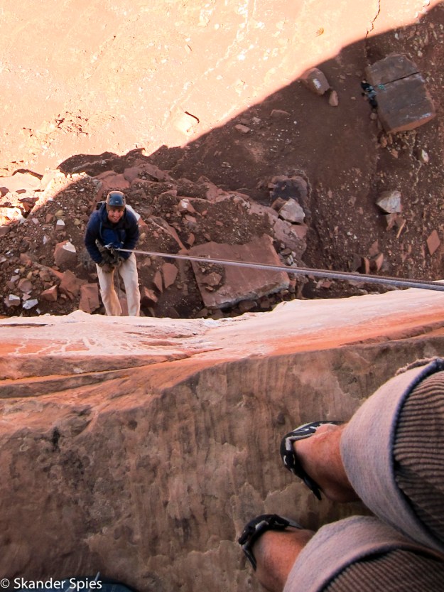 Jordan and I prepared carefully on Saturday night and got out the campground at 5:30am on Sunday morning. We followed the guidebook approach directions carefully and found the dirt road we expected. Approach roads for climbing routes are often difficult and this one was no exception, but the psyche was high and the judgement was low in the early morning hour. We had our doubts but the direction in the guidebook matched what we saw on the road and we continued through increasingly worse terrain. We finally got the car stuck at the bottom of a rough wash a few miles out from the paved road. We turned around but couldn’t make it back out. We unloaded the car and made another go of it- turns out 600lbs of climbing and camping gear affects both acceleration and ground clearance. We got out of the wash, reloaded the car and headed back towards pavement.