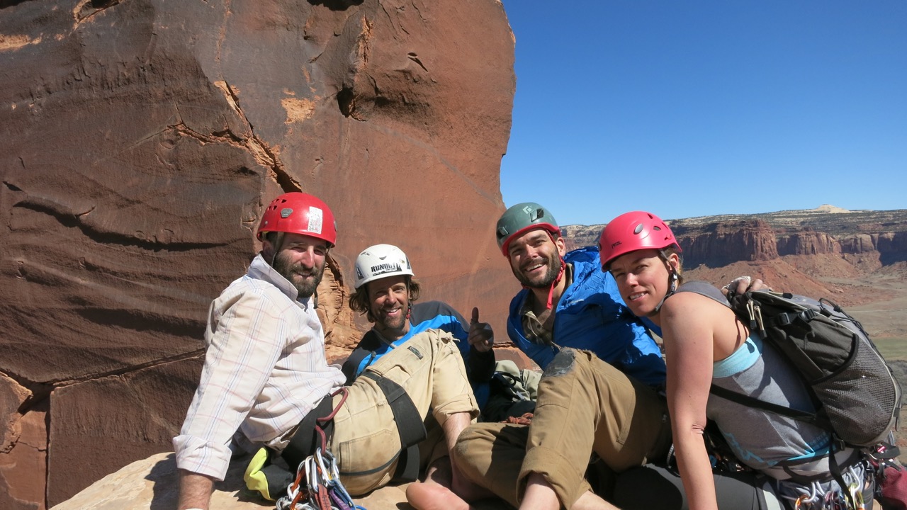 We met Ben and Mark from Grand Junction at the bottom, and they followed us up to make the rappel easier. I led both pitches and despite some very sporty climbing on the second pitch, we all had a pile of fun. It was Vicki’s first tower, and fun to have another party on top with us.