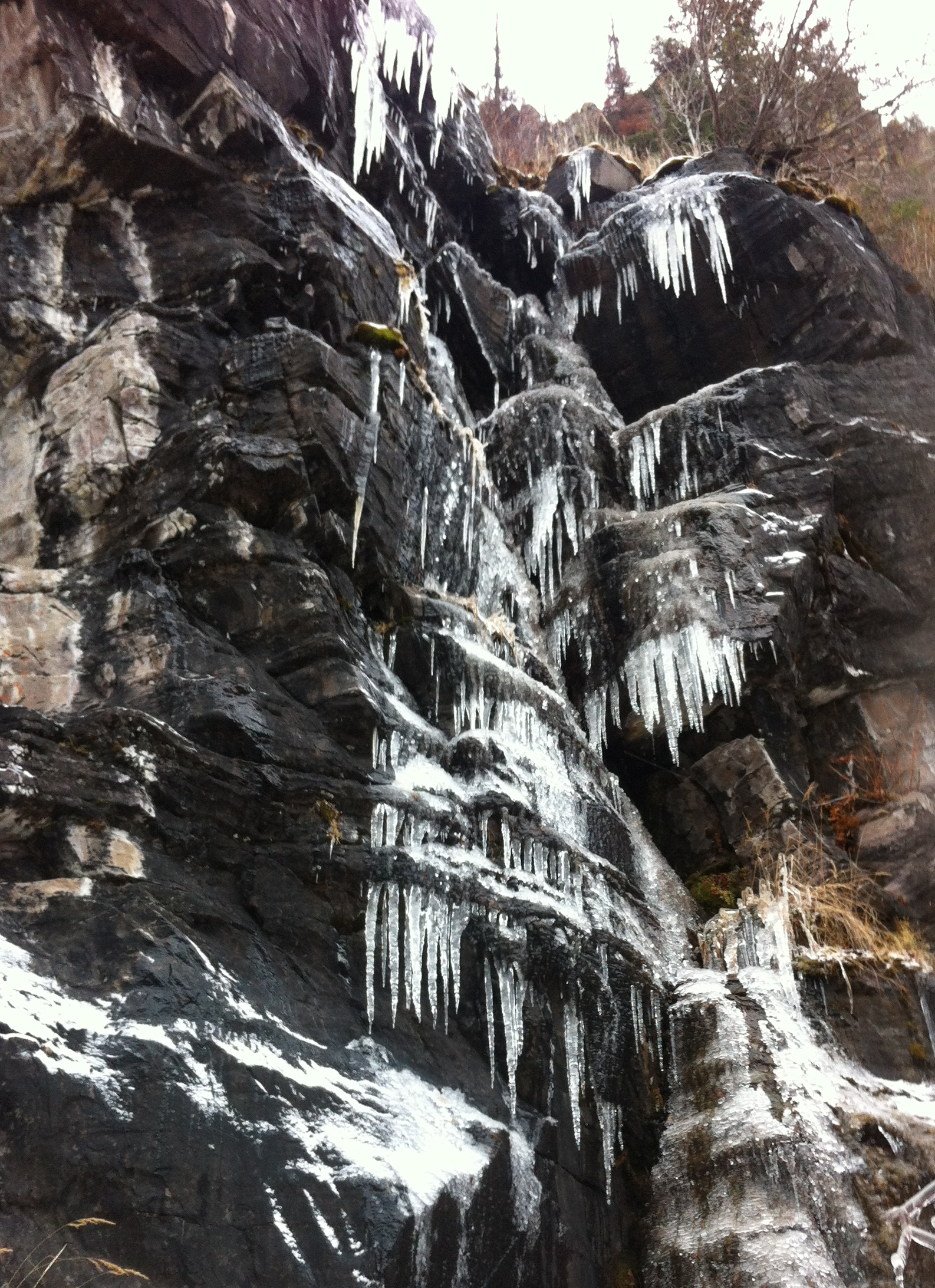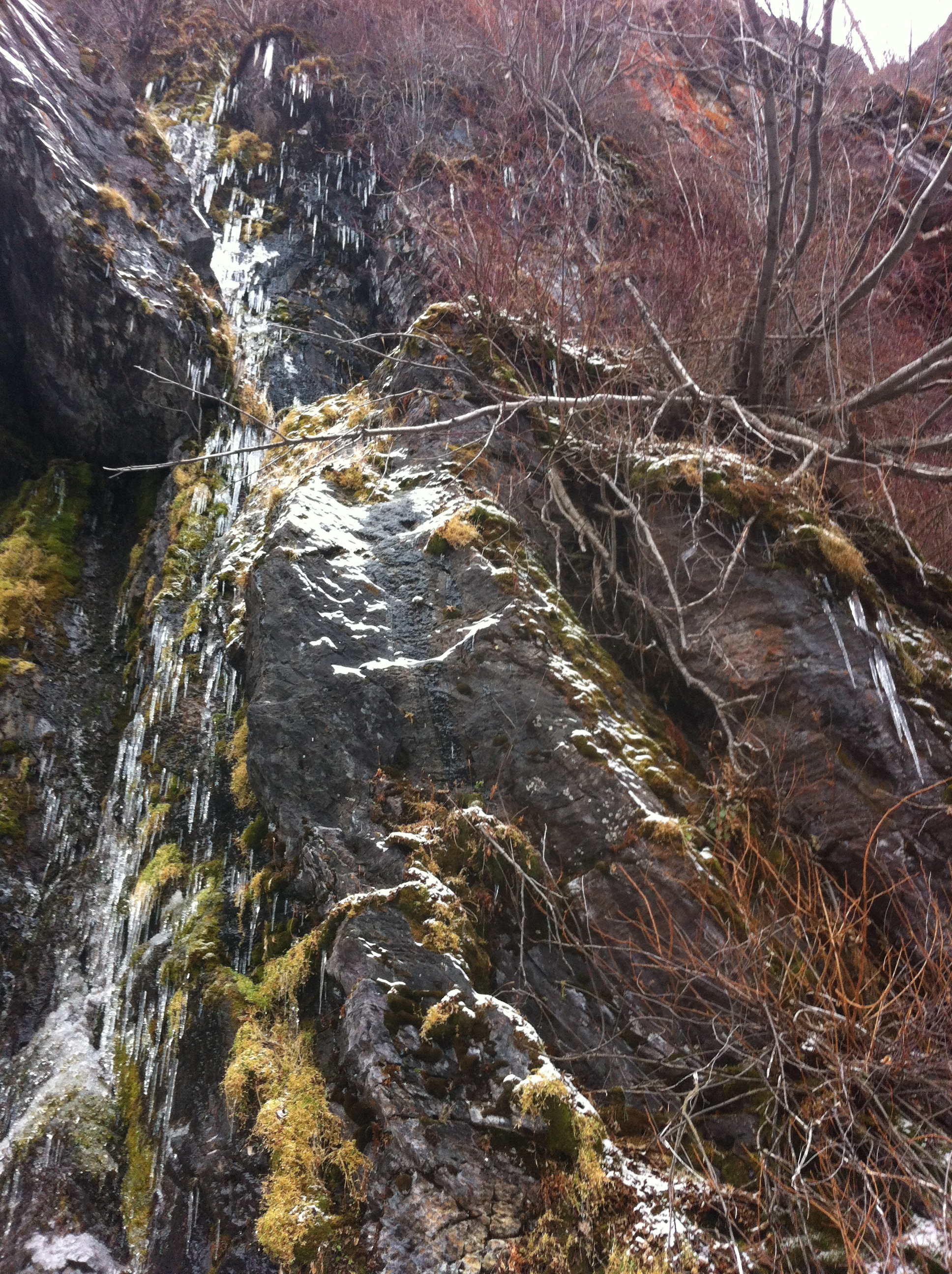 This past Saturday night I was playing my bass with some people and feeling antsy. Talk to Hannah to learn she had almost recovered from her cold, so at the last minute we made plans to climb Sunday morning. Happily, I finally got to tick the Graineater (70m, WI4, 2p)- the local classic is exactly that, classic. A few photos: